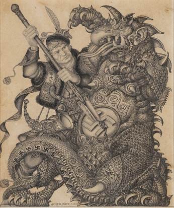 Prawdopodobnie rycina przedstawiająca walkę ze smokiem pochodzi z tego zbioru. Widać typowe dla artysty techniki miniatury. Postacie są stworzone z wyjątkową starannością. Grafika przedstawia prostego mężczyznę, w stroju stylizowanym na chłopski, z typową, polską czapką „konfederatką” (miękką rogatywką, która rozpowszechniła się w Polsce jako nakrycie głowy w okresie konfederacji barskiej, 1768‒1772, a następnie została zaadaptowana jako nakrycie głowy regularnej Kawalerii Narodowej). Mężczyzna na grafice ma przypięty do czapki krzyż i pióro. To chłop stający się żołnierzem w sytuacji zagrożenia. Walczy ze smokiem – symbolem zła, stworzonym z samych swastyk. Artysta nawiązuje w tej pracy do znanego od średniowiecza, ikonograficznego przedstawienia walki św. Jerzego ze smokiem. Bohater Szyka zadając cios, wbija włócznię z napisem Polska Ludowa. Pomimo zbieżności słów, to wyraz wiary w polski lud a nie antycypacja nadchodzącej komunizacji Polski. Szyk był bowiem zagorzałym przeciwnikiem systemu sowieckiego.