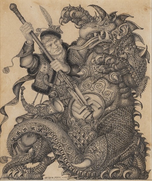 Po dojściu Hitlera do władzy (1933) Artur Szyk zaangażował się w działania antyfaszystowskie. W 1937 r. osiedlił się w Londynie, a w 1940 r. przeniósł się do Stanów Zjednoczonych. Tworzył rysunki ukazujące dramat wojenny, losy Żydów i Polaków, publikowane m.in. w prasie anglojęzycznej. Po wybuchu powstania w getcie warszawskim (1943) stworzył cykl poruszających prac poświęconych walczącym.